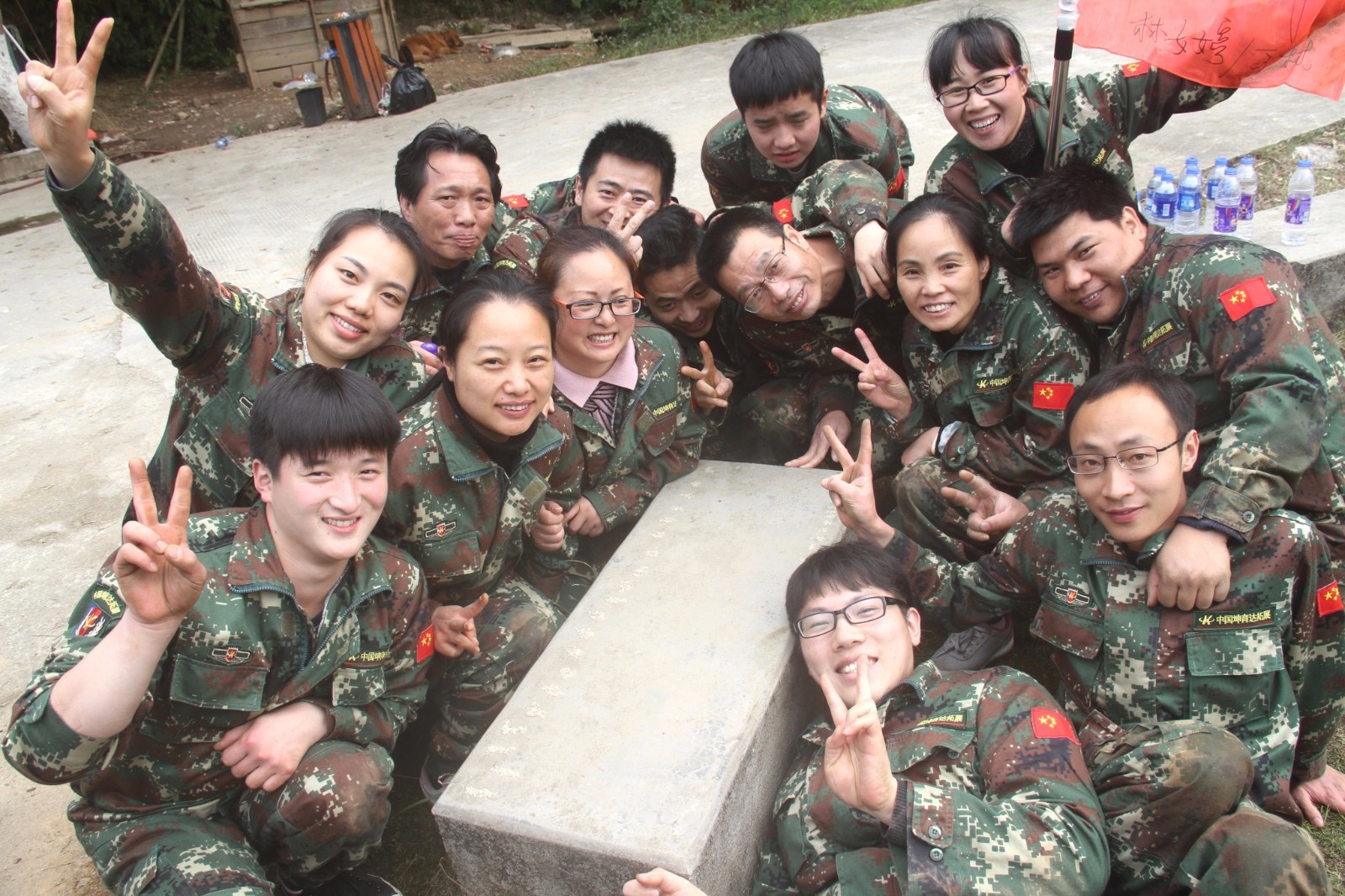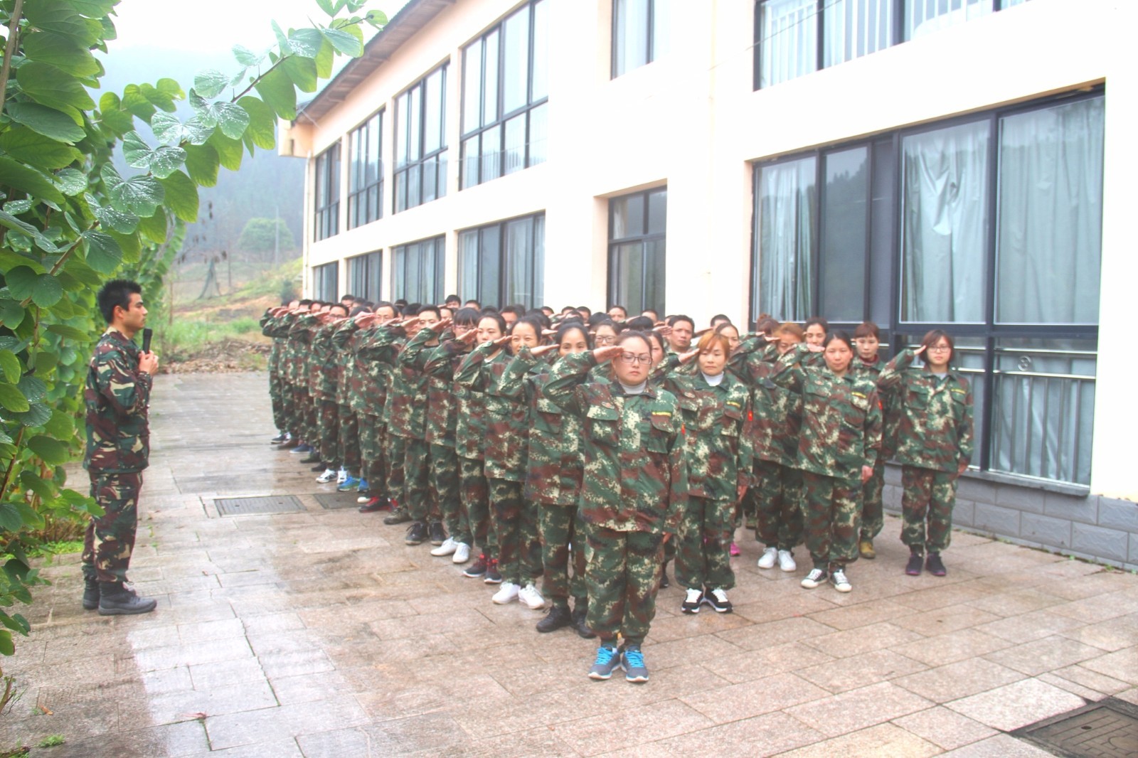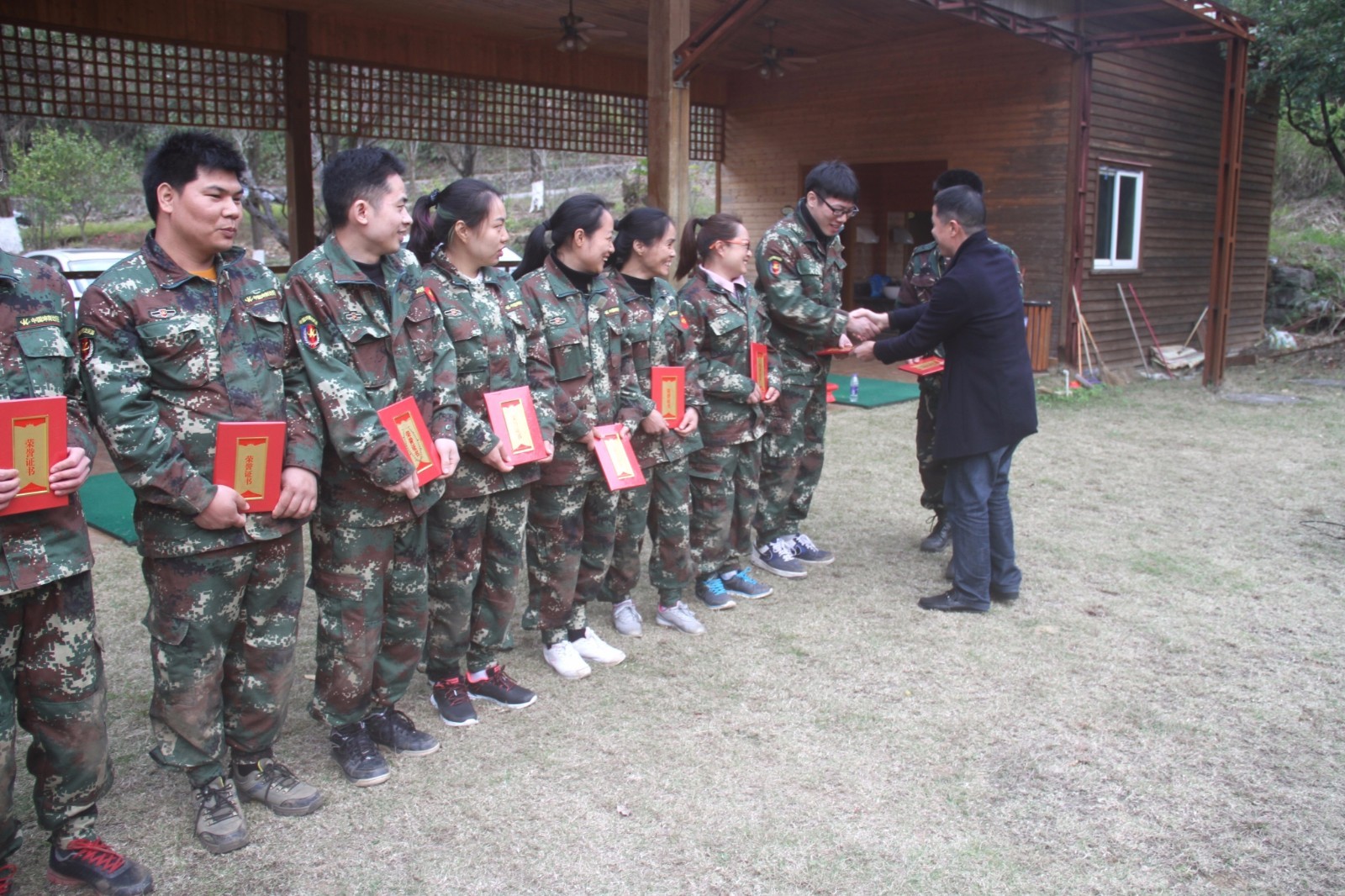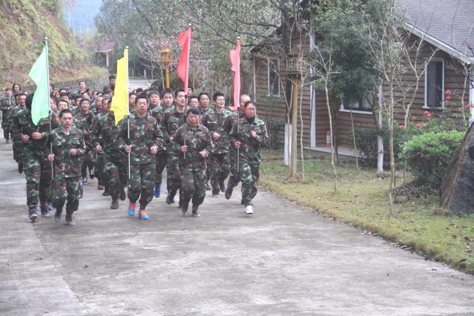 第一天團隊統(tǒng)一著裝迷彩服,進行團隊組建并建立統(tǒng)一的團隊目標(biāo)。參加心情撲克牌、高空抓桿、盜夢空間、七巧板等項目。
