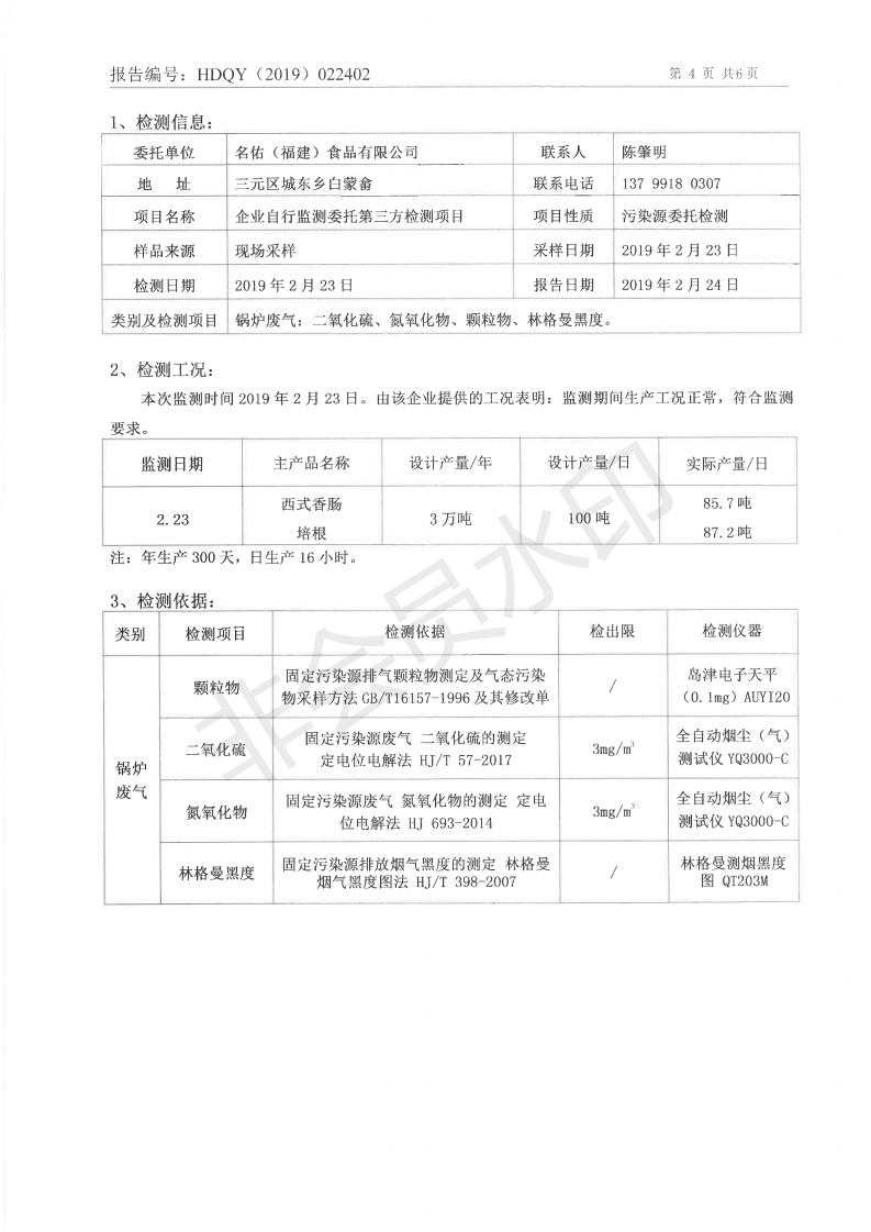 名佑(福建)食品有限公司2019年度3月環(huán)境自行監(jiān)測信息