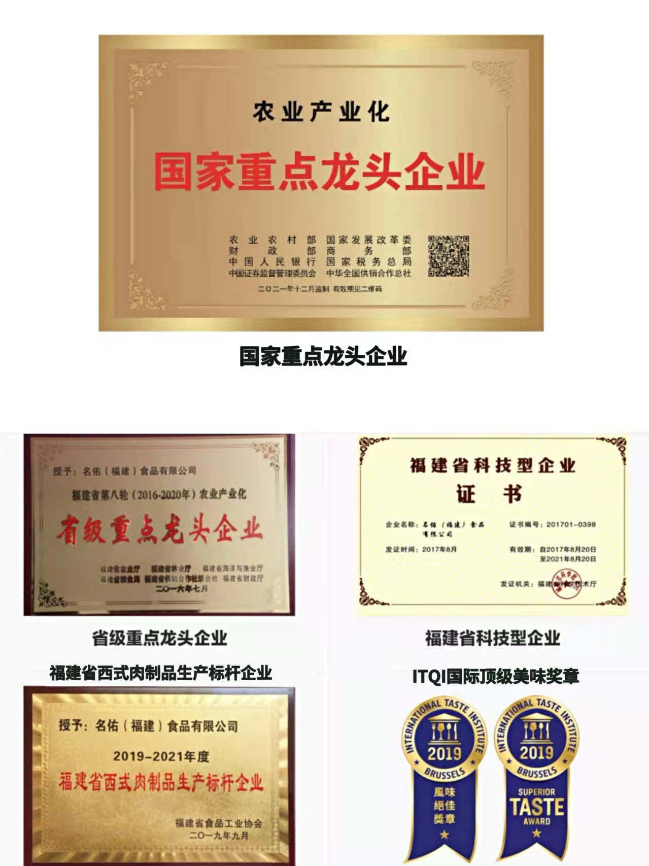 公司沿著“品牌化運作,職業(yè)化經(jīng)營”戰(zhàn)略思想,在全體員工的共同努力下,“名佑”牌培根市場占有率不斷攀升,成為全國較大低溫西式肉制品培根制造商,不斷得到社會認可和政府支持。公司被授予“農(nóng)業(yè)產(chǎn)業(yè)化國家級重點龍頭企業(yè)”、“全國模范職工之家”、“福建省民營企業(yè)黨建工作先進單位”“福建省守合同重信用企業(yè)”、“福建省科技小巨人領軍企業(yè)”、“福建省西式肉制品生產(chǎn)標桿企業(yè)”、“三明市十佳誠信用工企業(yè)”、“三元區(qū)納稅大戶”;公司“名佑”商標被評為“福建省著名商標”;公司經(jīng)典培根被評為“福建省名牌產(chǎn)品”,榮獲《ITQI國際頂級美味獎章》,憑借著專業(yè)和美味受到了國內外餐飲行業(yè)的一致好評。
